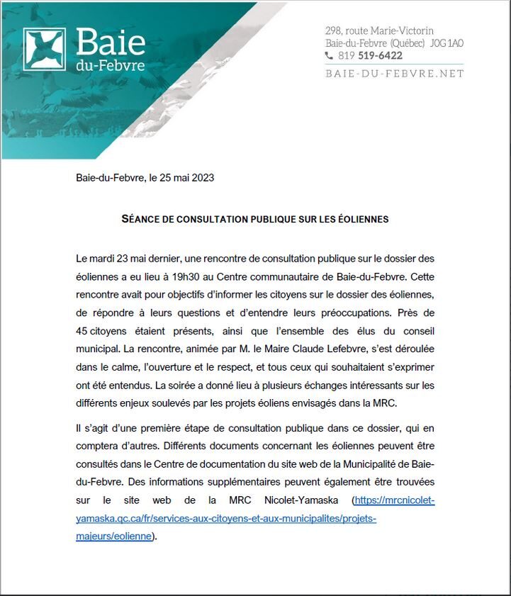 Une séance de consultation publique sur les éoliennes a eu lieu a Baie-du-Febvre le mardi 23 mai dernier.